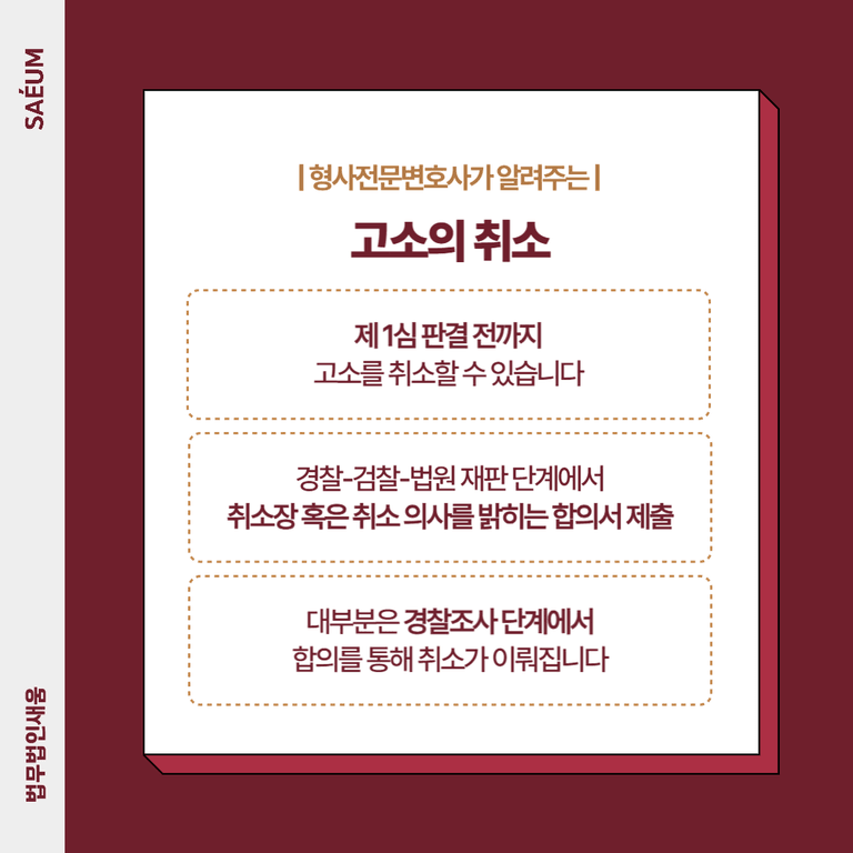먼저 형사소송법 제232조에 따르면 고소는 제1심의 판결이 나오기 전까지 취소할 수 있습니다. 이때 취소하는 방법은 고소와 비슷한데요. 형사절차가 진행된 단계에 따라서 수사기관을 혹은 법원에 취소장을 제출해야 합니다.