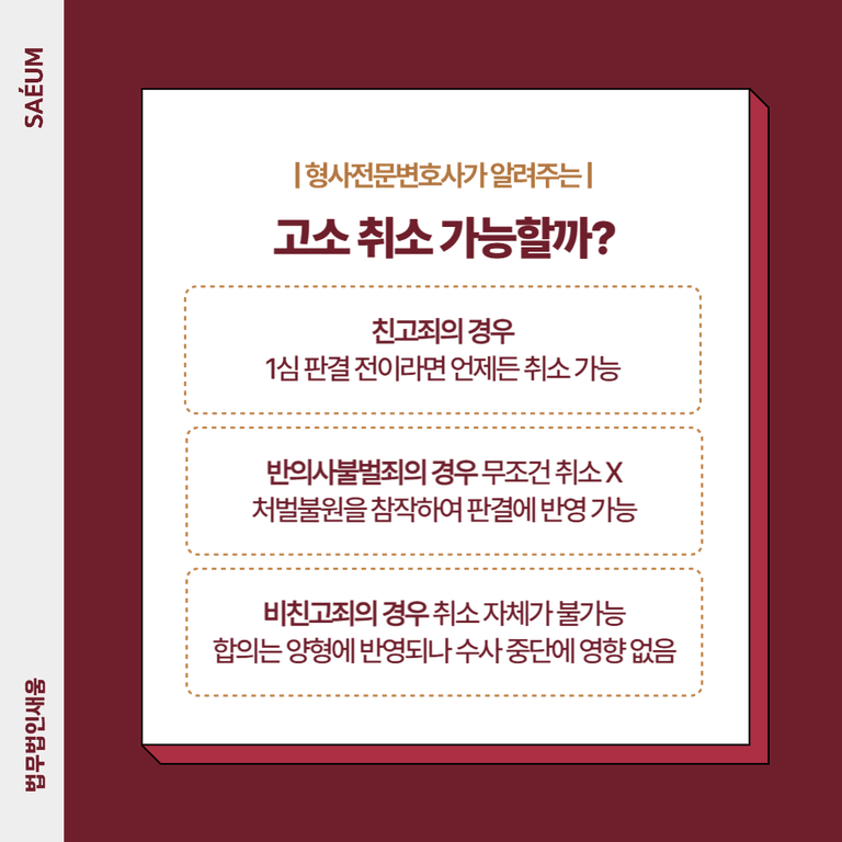 예를 들어 가해자를 신고하였는데, 중간에 사과하고 합의에 이르러 더 이상의 진행을 원치 않는다면, 고소권을 취소하는 것이 가능할지 질문하는 분들이 계십니다. 결론적으로 말씀을 드리자면 그렇기도 하고, 아니기도 합니다.