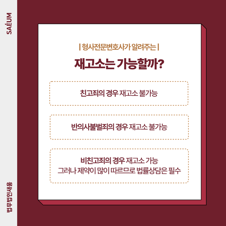 간혹 어떤 분들은 한 번 신고하였다가 취소한 다음 다시 고소하는 것이 가능한지 질문을 하십니다. 앞서 언급한 법규에 따르면, 친고죄와 반의사불벌죄의 경우 재고소는 불가능합니다.