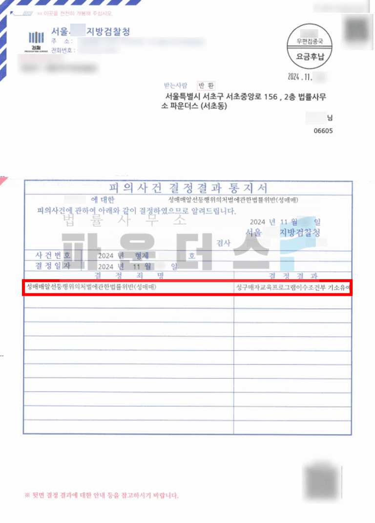 그 결과 의뢰인은 1회 성매매에 이른 사건에 있어 기소유예 처분으로 마무리 지을 수 있었습니다.