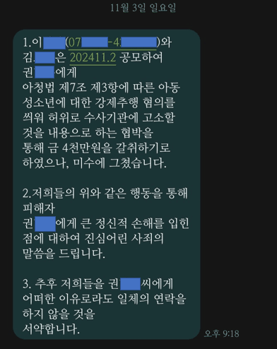 이후 의뢰인의 친구와 B씨는 자신들의 행위에 대해 자백 및 반성의 의사를 보였고, 다시는 의뢰인 A에게 연락하지 않겠다고 말했습니다.