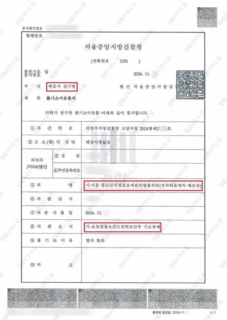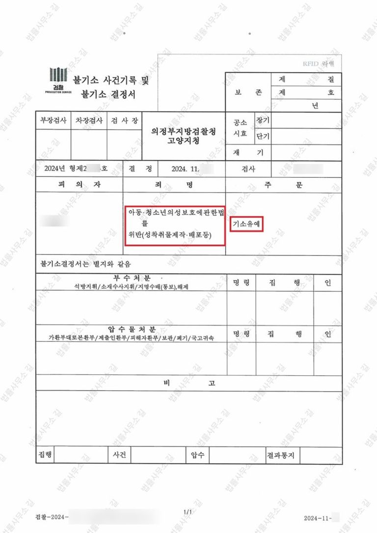 결국 검찰은 변호인 의견서의 내용을 수용하여 성착취물 제작·배포 혐의에 대해서는 보호관찰소 선도위탁조건부 기소유예 처분을 하였습니다.