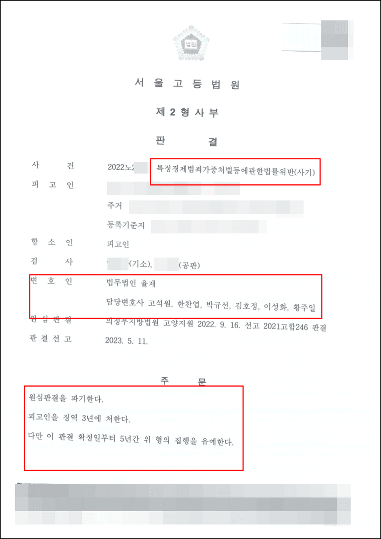 본 사건은 동업자 간 동업 계약 내용 미이행으로 발생한 사기 사건입니다. 피해액의 규모가 5억 원 이상이기에 형법상 사기죄가 아닌 '특정경제범죄가중처벌등에관한법률'이 적용되어 일반 사기죄와 달리 무거운 처벌을 피하기 어려운 사건이었습니다.