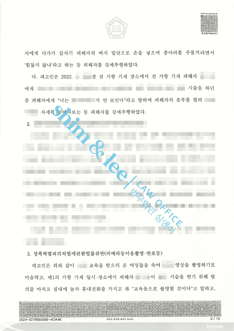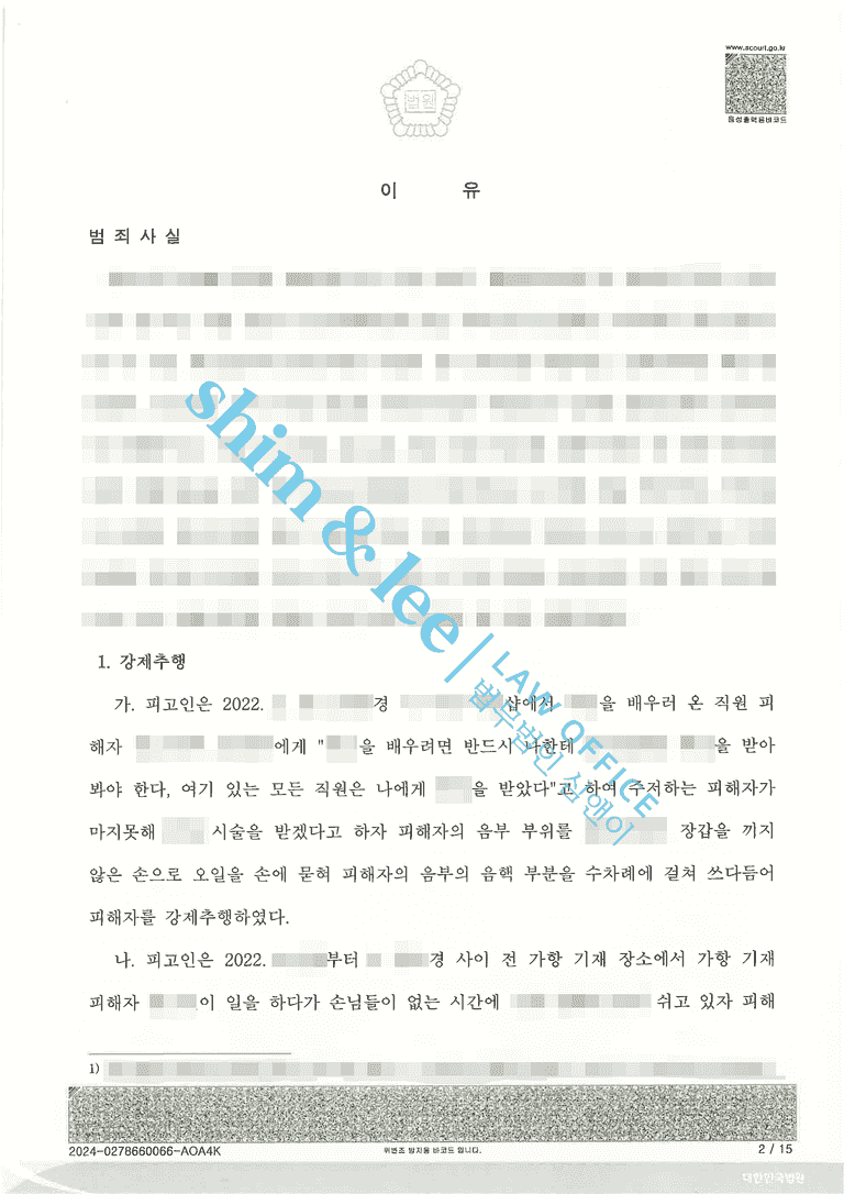 - 하지만 그 후 가해자는 쉬고 있는 의뢰인에게 다가와 종아리를 주무르거나 음란한 대화를 하는 등 부적절한 행동을 지속하였습니다. 의뢰인은 이것이 업무의 범위를 벗어난 명백한 범죄임을 깨닫고 신고를 하기 위해 퇴사를 하고, 심앤이를 찾아주셨습니다.