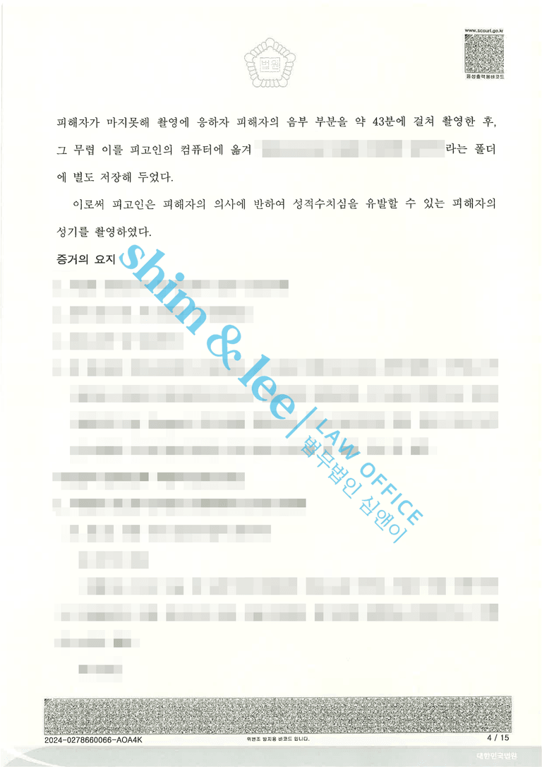 4. 하지만 가해자는 재판에 이르기까지 “피해자가 시술과 촬영에 동의를 했다”, “시술 전 민감한 부위를 터치할 수 있다는 동의서를 받았다”고 주장하며 모든 혐의를 부인하고 무죄 주장을 이어갔습니다. 이에 피해자는 사전 이해가 전혀 이루어지지 않은데다 선택권이 없는 상태에서 한 동의는 진정한 의미의 동의가 아니라는 점을 강조하는 변호사 의견서를 제출했습니다. 특히, 관련 판례를 들어 의뢰인의 동의는 가해자의 피부과에 취업하기 위해 어쩔 수 없이 동의한 것이며 동의를 받는 과정에 분명 가해자의 압력이 존재했기에 적법한 동의가 아님을 주장했습니다.