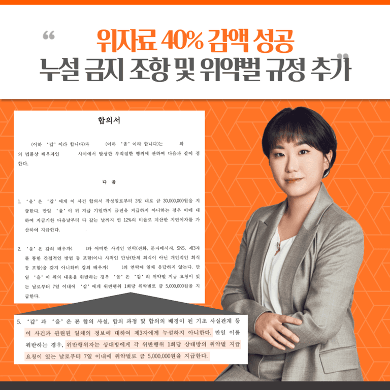 단, 이틀만에 상대방이 제시한 위자료의 40% 감액하였을 뿐만 아니라, 누설 금지 및 명예훼손 방지 조항 추가한 합의서를 작성하였습니다.