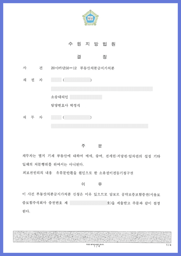 상속인들인 채권자가 주장하는 유류분 산정을 위한 기초재산 및 채무자가 증여받은 특별수익 재산의 가액, 채권자의 유류분부족액 등을 산정하여 상속인인 채권자가 채무자로부터 반환받을 유류분이 존재한다고 판단하면서 상속인들이 가처분을 하는 대상 부동산은 채무자가 피상속인으로부터 유증받은 부동산이 분명하므로 채무자는 해당 부동산 중 다른 상속인들인 채권자의 유류분에 해당하는 지분을 반환할 책임이 있다고 보았습니다. 다행히 다른 상속인들인 채권자의 경제적 사정 등을 고려하여 재판부는 공탁보증보험증권을 제출받는 방법으로 소정의 금원을 공탁하게 하였습니다.