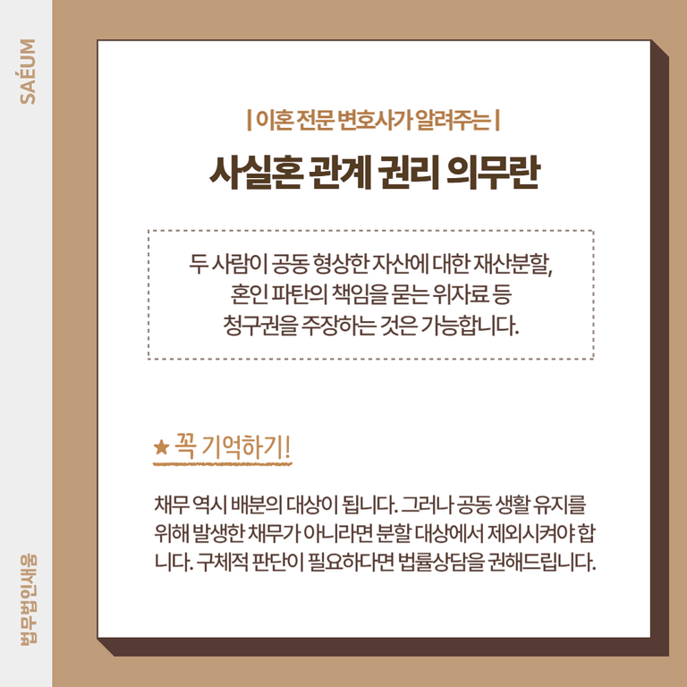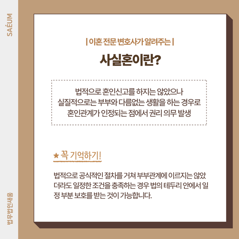 법적인 관점에서는 부부로 인정하지 않더라도 실제 현실에서 결혼생활을 유지한 사실이 드러나면 시비를 다투어야 하는 부분들이 발생할 수 있기 때문입니다. 반대로 자신이 사실혼의 배우자인 경우에도 마찬가지입니다. 법적으로 지위를 획득하지 않았더라도 일정 부분 권리를 주장하는 것이 가능하다는 점에서, 쉽게 포기해서는 안 됩니다.