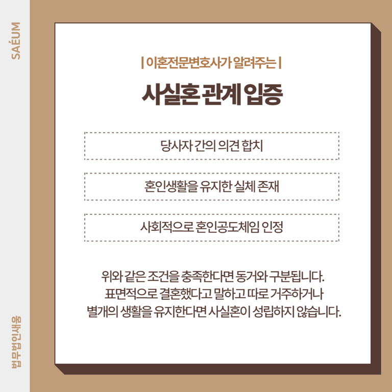 위와 같은 조건을 충족하는 때에만 단순한 동거와 구분됩니다. 표면적으로 결혼했다고 말하고 따로 거주하거나, 별개의 생활을 유지한다면 사실혼이 성립하지 않습니다.
