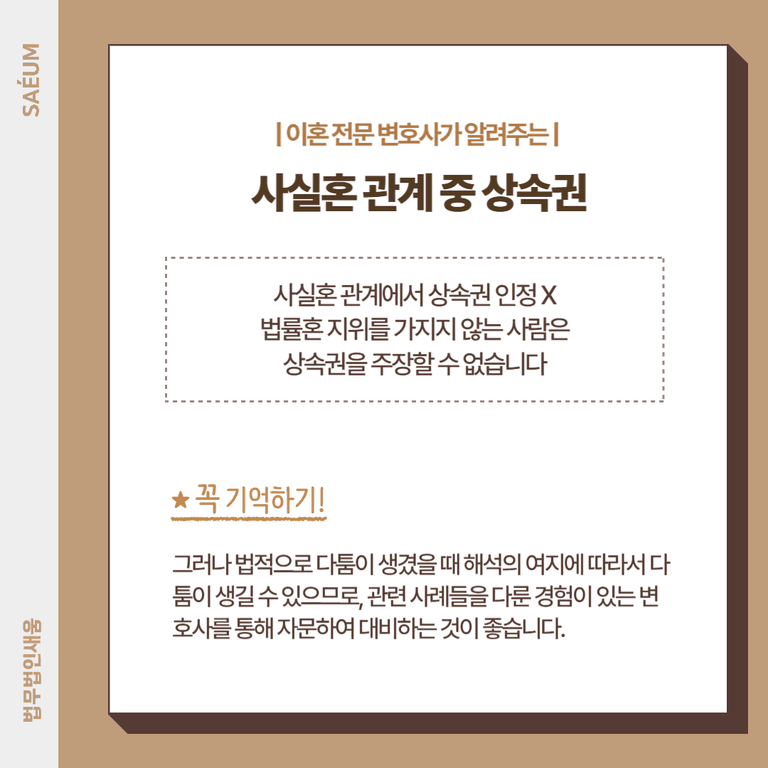 원칙적으로 법률혼의 지위를 가지지 않은 사람은 상속권을 주장할 수 없습니다. 그러나 법적으로 다툼이 생겼을 때 해석의 여지에 따라서 다툼이 생길 수 있으므로, 자신이 이러한 일에 휘말렸다면 혼자 대처하기보다는 관련 사례들을 다룬 경험이 있는 변호사를 통해 자문하여 대비하는 것이 좋습니다.