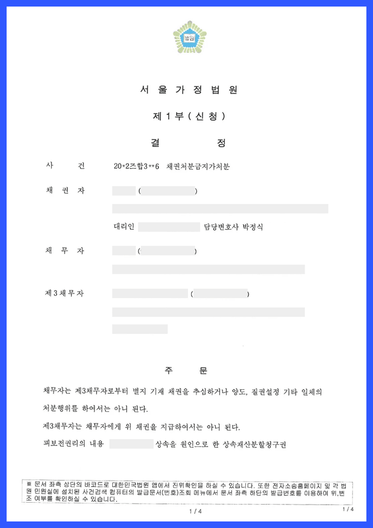 채권자는 채무자의 명의로 되어 있는 펀드 상품을 채무자가 임의로 처분하면 향후 상속재산분할심판에서 위 펀드 상품이 분할되더라도 집행불능의 상태가 될 것을 염려하여 재판도중에 가정법원에 상속재산분할청구권을 피보전권리로 한 채권처분금지가처분신청을 한 사건입니다.
