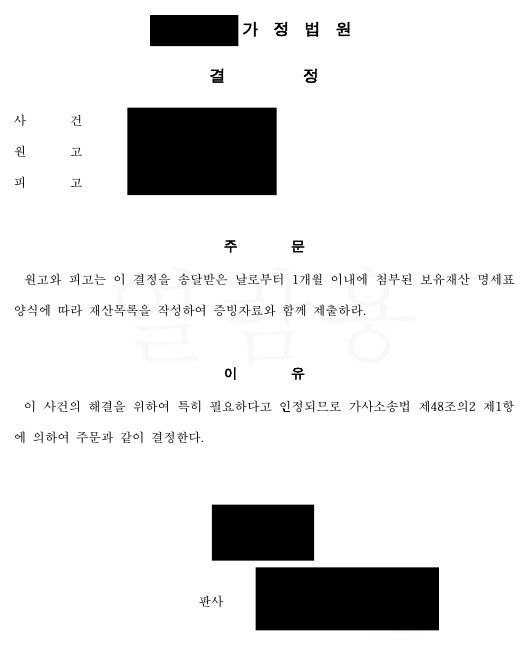 가사소송법 제48조의2 제1항은 ‘재산분할을 위하여 필요하다고 인정되는 경우 직권으로 또는 당사자의 신청에 의하여 당사자에게 재산상태를 구체적으로 밝힌 재산목록을 제출하도록 명할 수 있다’라고 규정하고 있습니다.