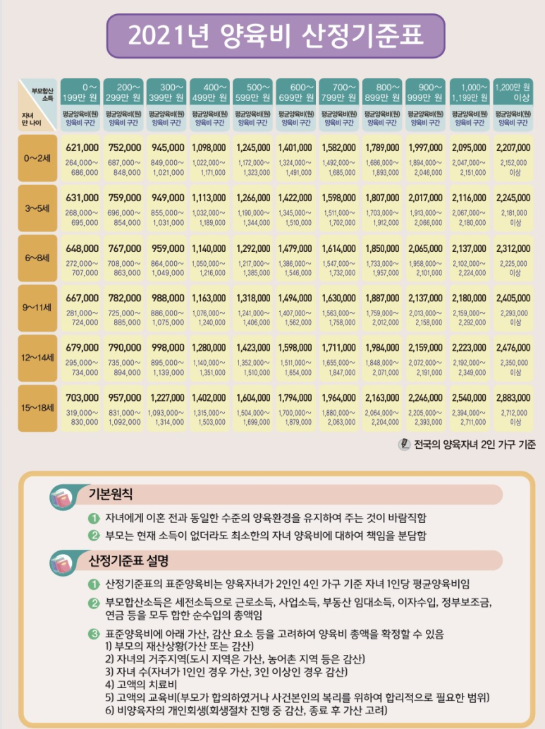 아래는 가장 최근인 2021년 12월 공표된 양육비산정기준표입니다.