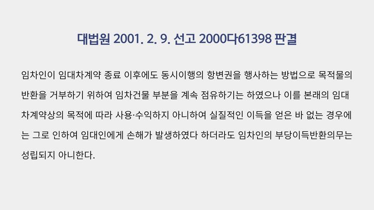 쉽게 설명드리면, 임차인이 임대차목적물을 임대인에게 인도하지 않은 것만으로 차임상당 부당이득을 공제할 수 있는 것은 아니고, 임차인이 임대차목적물을 실제로 사용한 경우에만 차임상당 부당이득을 공제할 수 있다는 것입니다.