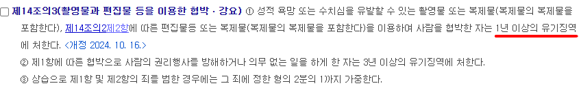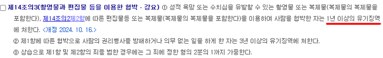 성폭력처벌법상 촬영물등이용협박죄가 성립하는 경우 1년 이상의 유기징역에 처하도록 되어 있어
