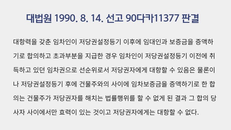 따라서, 보증금을 증액하여 갱신 계약하시는 경우에는, 임대차목적물의 등기부등본을 반드시 확인하셔서, 기존 임대차계약일 이후로 새로이 설정된 근저당권 등이 없는지를 잘 살펴보셔야 합니다.