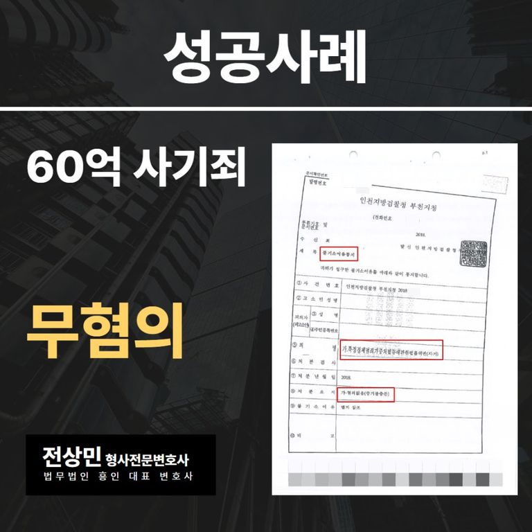 그 결과 검찰에서는 본 변호인의 주장을 모두 받아들였고, 당시 의뢰인이 연루된 60억 사기죄 혐의에 대해 증거불충분, 즉 ‘무혐의’로 사건을 종결하며, 다행히도 좋은 결과를 얻을 수 있게 되었습니다.