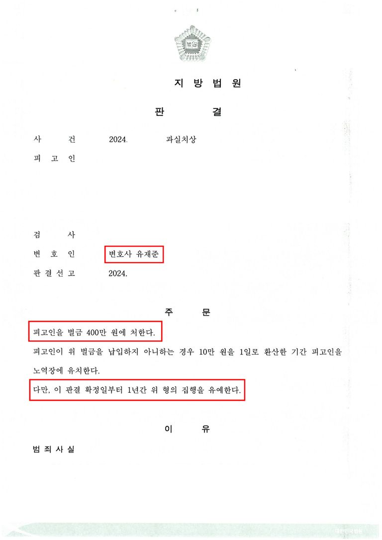 ○ 본 변호사의 조력: 본 변호사는 피고인의 정상에 대한 여러가지 사유를 제시하는 변론을 하였고, 재판부께서는 피고인에게 벌금형에 처하되 집행유예 판결을 내리셨습니다.