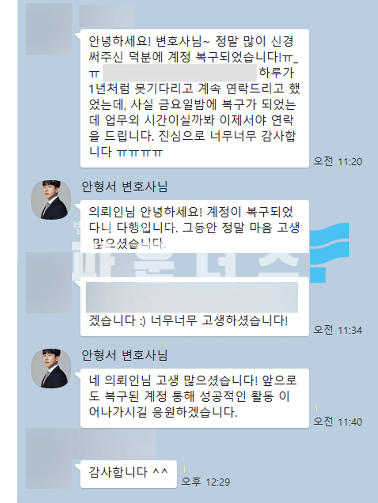 본 법률대리인은 비활성화된 SNS 계정을 복구함에 있어 실제 성공 사례 경험을 토대로 전체 플로우와 노하우에 대한 심도있는 이해를 기반으로 계정 복구에 적극적인 도움을 드립니다.