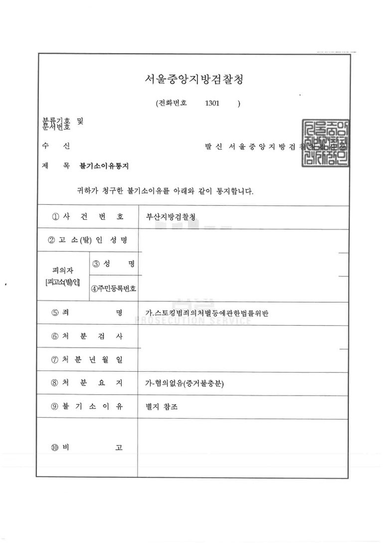 - 경찰 조사 이후, 위와 같은 사실관계를 바탕으로 의뢰인의 행위가 스토킹 처벌법 구성요건에 해당하지 않는 다는 점, 그리고 의뢰인이 반성하고 있다는 점 등을 정리한 의견서로 제출한 결과 스토킹처벌법 위반에 대하여 증거불충분 혐의없음 처분을 받아 사건을 마무리 할 수 있었습니다.