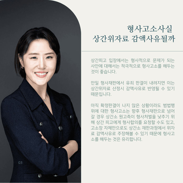 만일 형사재판에서 유죄 판결이 내려지면 이는 상간위자료 산정시 감액사유로 반영될 수 있기 때문입니다.