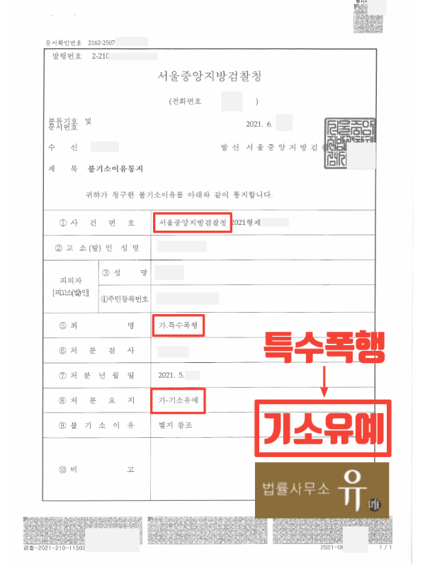서울중앙지검은 피해자에게 수차례 폭력을 가하고 위험한 물건까지 사용해 위협적인 행동까지 한 점에서 죄질이 무겁지만, 유(唯)변호사가 제출한 의견서 및 참고자료를 받아들였다며 기소유예 처분을 하였습니다.