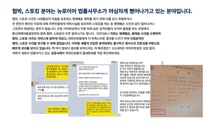 저희는 여러분과 같이 인플루언서 스토킹 피해를 당하신 의뢰인분들을 도와 엄중한 처벌과 합당한 배상을 이끄는 데 도움을 드리고 있습니다.