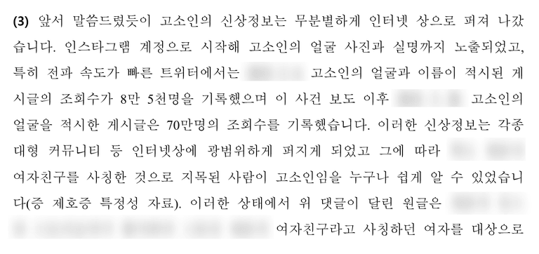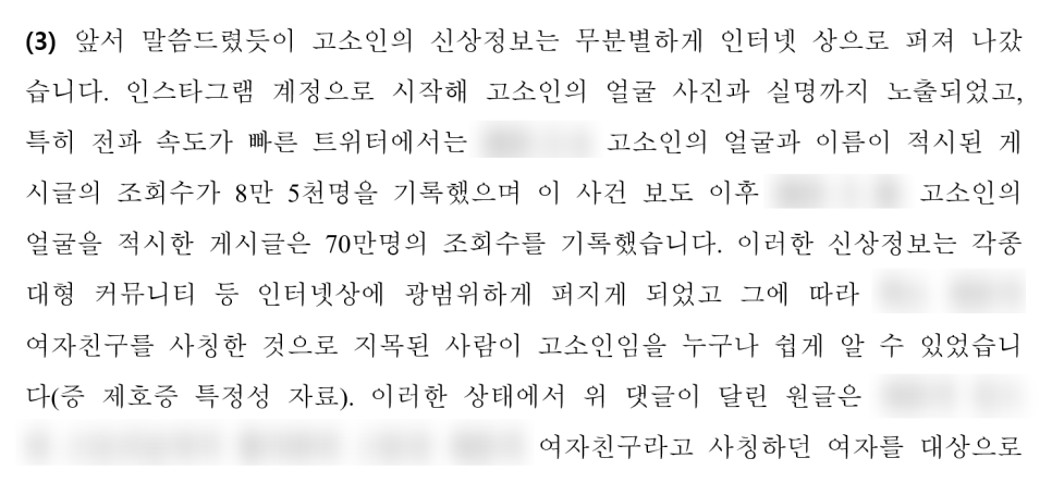 그러나 이 건에서는 의뢰인분의 인스타에 얼굴 사진이 다 있었고 각종 SNS와 커뮤니티에 이미 의뢰인분의 얼굴 사진 등 신상정보가 널리 퍼진 상태였습니다. 저희는 이러한 자료가 삭제되기 전 모두 확보하여 특정성을 주장하는 데 무리가 없었습니다.
