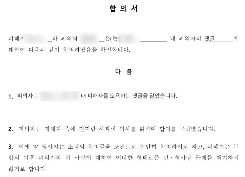 인터넷 마녀사냥 악플고소 합의서 중 일부