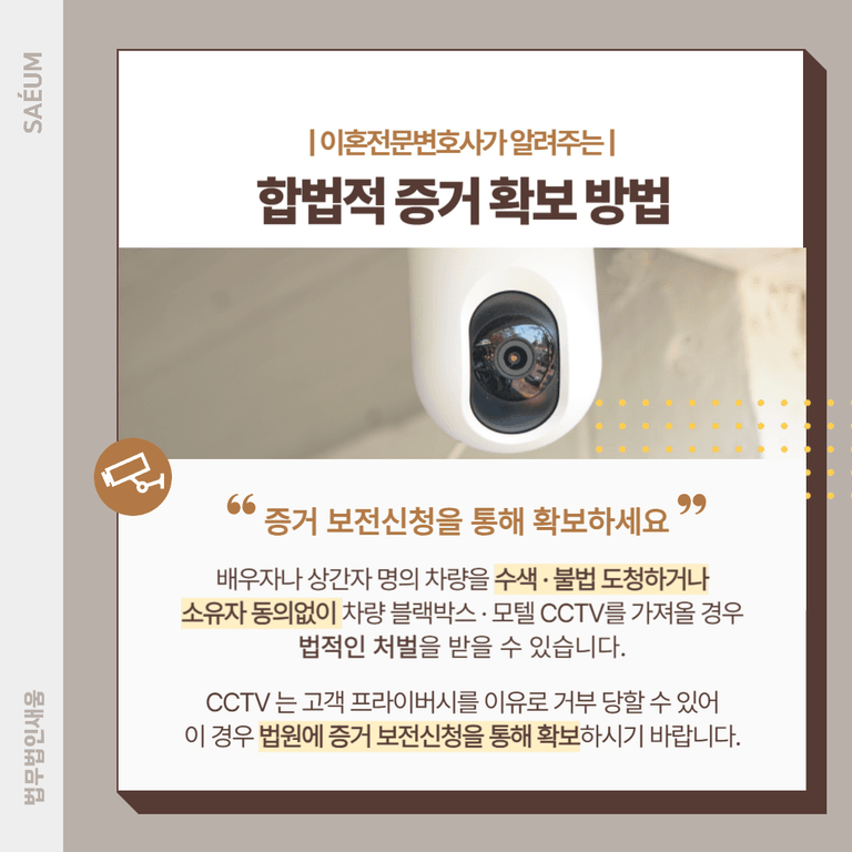 예를 들어 본인 명의가 아닌 배우자나 상간자 단독 명의의 차량을 수색하거나 불법 도청을 하는 경우, 소유자의 동의 없이 블랙박스나 CCTV 등의 자료를 가져오는 경우 법적인 처벌을 받게 될 수 있습니다. 특히 모텔 CCTV의 경우 장소의 특성상 드나든 기록만으로도 결정적인 증거가 될 수 있어 꼭 확보해야 하는데, 소유자에게 협조를 요청한다고 하여도 고객들의 프라이버시 등을 문제로 협조를 받지 못할 가능성이 높습니다.