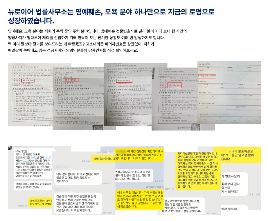 저희는 뉴진스 팬덤 팀버니스 악플 집단 고소를 대리, 버튜버 악플 고소 등 명예훼손, 모욕죄 사건을 책임지고 도와드리고 있습니다.