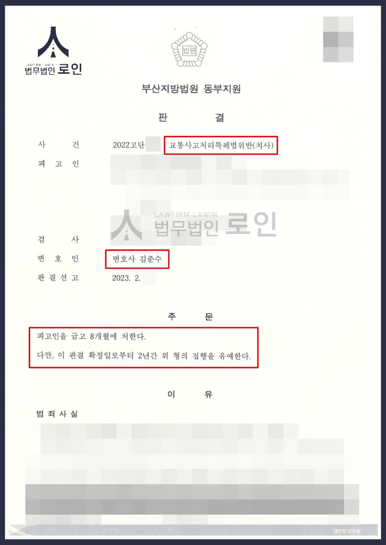 이 사고로 안타깝게도 피해자는 사망하셨고, 의뢰인은 교통사고처리특례법위반(치사) 혐의로 실형이 선고될 위기에 처했습니다.