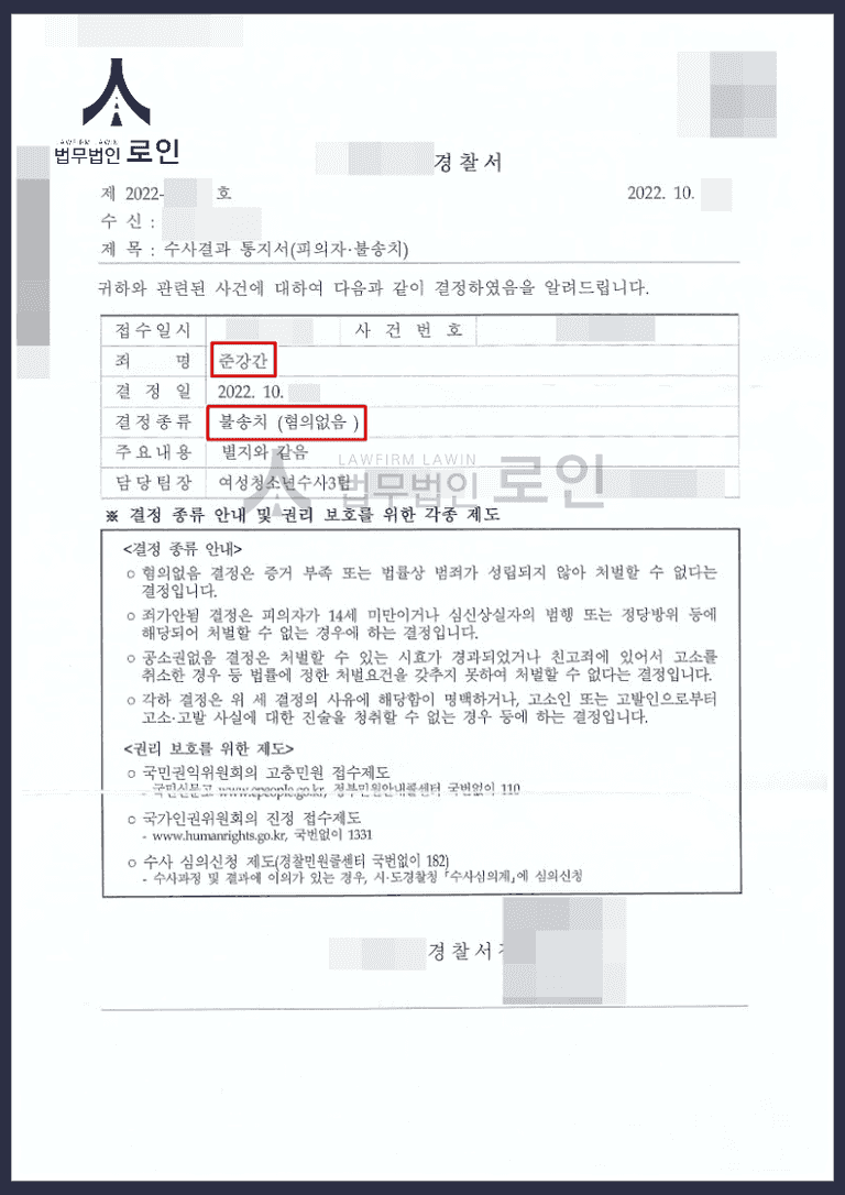 그 결과 경찰단계에서 불송치(무혐의) 결정을 받고, 의뢰인은 억울한 혐의를 벗을 수 있었습니다.