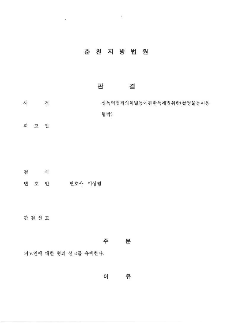 2. 의뢰인(피의자)과 상담한 후 바로 사건을 진행하기로 하였고, 의뢰인과 피해자가 헤어진 사이였지만, 연락을 하고 있는 상황에서 합의를 진행하는 것이 의뢰인과 피해자 모두 부담스러운 상황이었습니다. 그러나 이를 원만하게 소통하여 의뢰인과 피해자와 미팅을 진행하게 되었고, 피해자가 자발적으로 처벌불원서 및 탄원서를 작성하여 주었습니다. 이에 더하여 의뢰인에 관한 양형자료를 토대로 변론을 준비한 결과, 1) 피고인이 범행을 인정하고, 반성하는 점, 2) 피해자가 피고인에 대한 선처를 바라고 있는 점, 3) 우발적으로 이 사건 범행에 이른 점, 4) 타인에게 촬영물을 배포하지 않은 점, 5) 성폭력범죄로 형사처벌을 받은 전력이 없는 점 등이 참작되어 재판부로부터 최종적으로 선고유예 판결을 받아 사건을 마무리할 수 있었습니다.