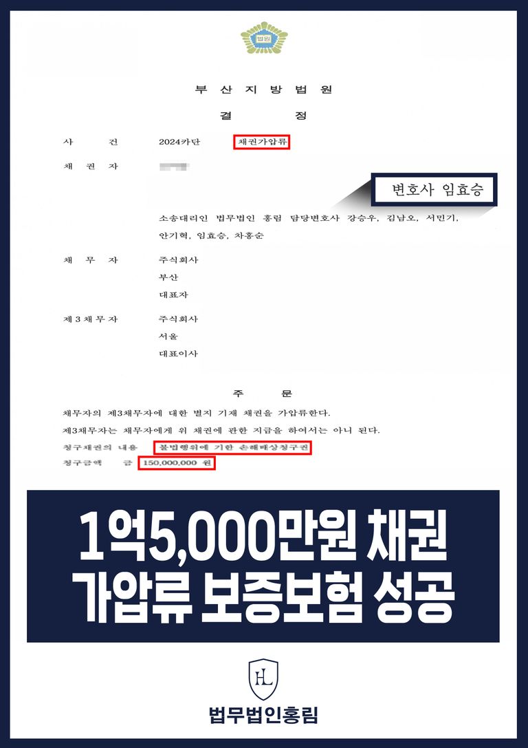 그 결과 법원에서는 본 변호인의 주장을 받아들여 통장 가압류(전액 보증보험)하였습니다.