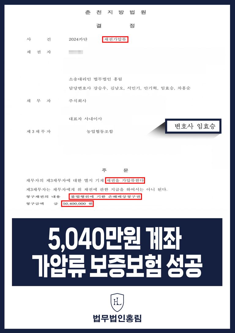 그 결과 법원에서는 본 변호인의 주장을 받아들여 통장 가압류(전액 보증보험)하였습니다.