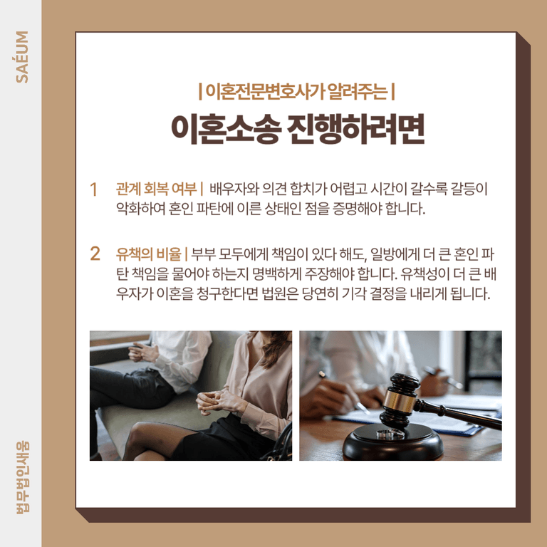 먼저 관계의 회복 여부입니다. 앞서 언급한 대로, 배우자와 더 이상 의견 합치가 어렵고, 시간이 갈수록 갈등이 악화하여 파탄에 이른 상태라는 사실을 증명해야 합니다.