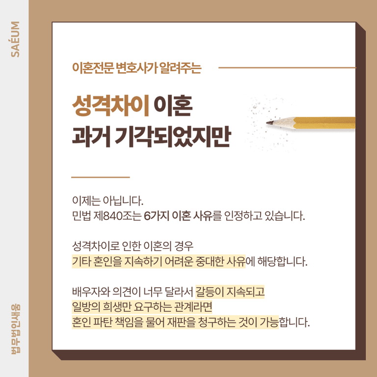 여기에서 성격차이 이혼이란 무엇인지, 이런 상황에도 유책사유로 책임을 묻는 것이 가능한지, 또한 원만하게 성격차이 이혼을 마무리하는 방법은 무엇인지 궁금하실 텐데요. 아래의 글을 통해 자세하게 알려 드리고자 하니, 읽어 보신 후에 법률 상담을 진행해 보시기 바랍니다.