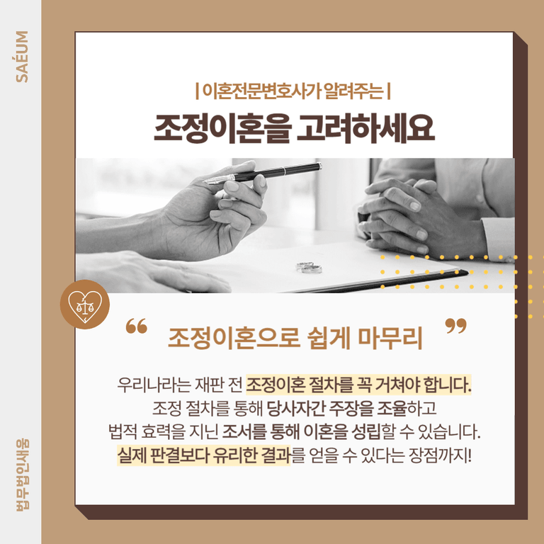 마지막으로 부부간에 갈등이 심화하여 타협이 어려워 재판을 고려한다면, 그전에 변호사에게 자문하여 조정이혼으로 마무리하는 것도 좋은 방법입니다. 우리나라는 조정전치주의를 채택하였기 때문에 소장을 접수하여도 반드시 먼저 조정이혼 절차를 거쳐야 하는데요.