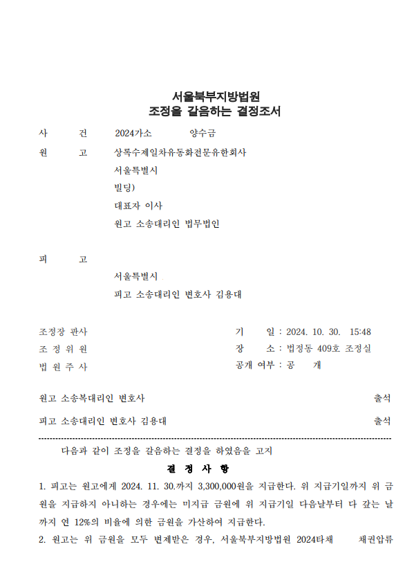 이에 본 법률사무소는 법원에 조정위원회 회부 신청을 하여 상록수제일차유동화전문 유한회사와 합의를 하여 이미 상록수제일차유동화전문 유한회사에서 계좌 압류를 통하여 추심하여 간 약 200만원을 제외한 나머지 원금 330만원을 지급하는 조건으로 나머지 이자를 모두 면책하는 것으로 법원이 강제조정을 하였고, 쌍방이 이의하지 않음으로써 결국 위 강제조정이 확정되어 A씨는 나머지 이자를 모두 면책받을 수 있었습니다.