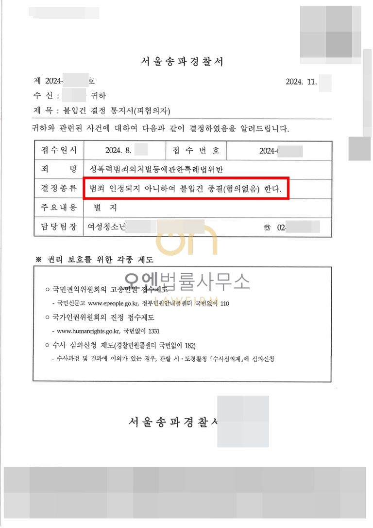 경찰은 의뢰인에게 범죄 인정되지 아니하여 혐의없음의 처분을 하였습니다.