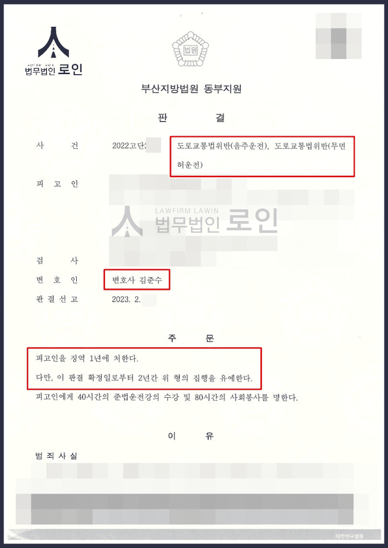 그 결과 재판부는 음주운전 4회 적발 및 무면허 음주운전 혐의에 대해 징역 1년, 집행유예 2년을 선고했고, 의뢰인은 다시 한 번 선처 받으며 구속을 면할 수 있었습니다.