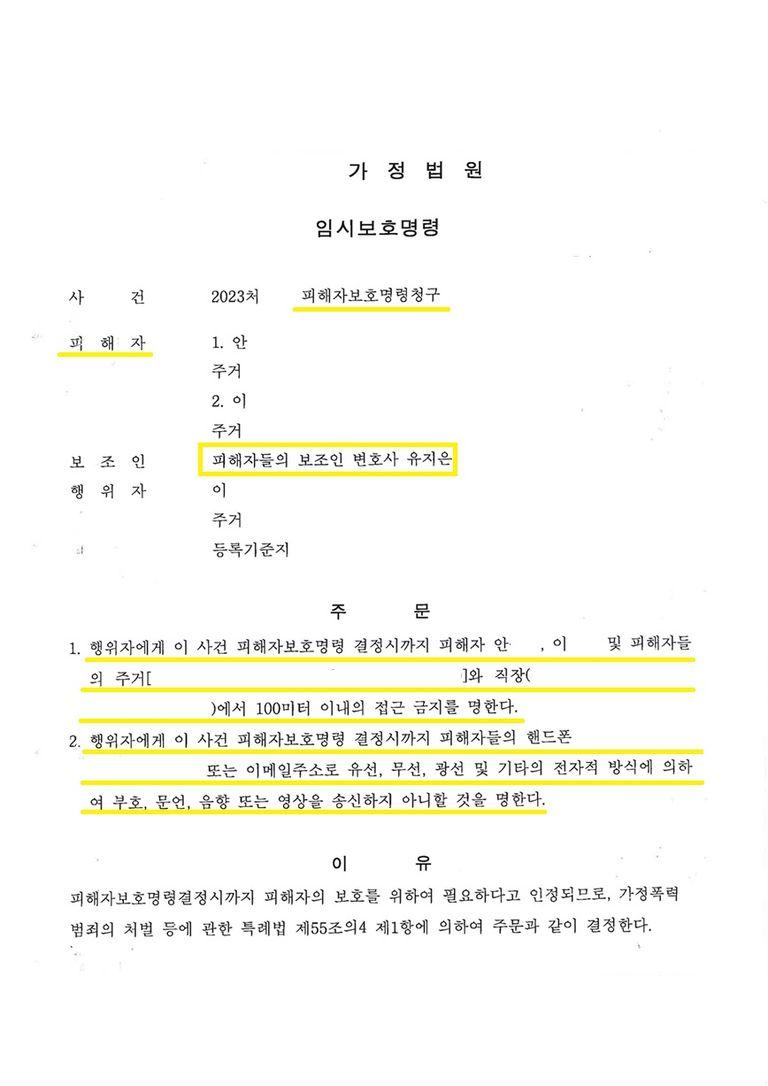 의뢰인은 평소에 폭력을 일삼는 남편을 피해 딸과 집을 나왔고 남편이 두려워 법적으로 이혼 절차를 마치지 않고 수년간 따로 거주하고 있었습니다. 공무원이던 아내는 어느날 남편에게 연락을 받게 되고 남편은 돈을 요구하며 돈을 주지 않으면 아내의 직장 및 딸의 학교로 찾아가 가만두지 않겠다는 협박을 하여 이 문제를 해결하고자 카라 법률사무소를 방문하였습니다.