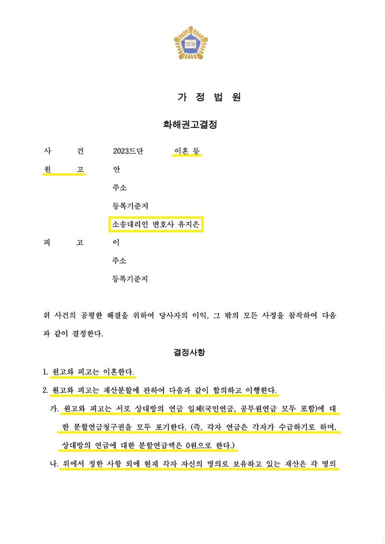 일반적으로 혼인 관계가 10년이 넘을 경우 재산분할로 절반을 주거나 채무도 분담하는 것이 맞지만 이 소송에서는 저희의 주장이 모두 인정되어 빚만 많던 남편으로 부터 재산을 지키고 각자 명의로 소유한 재산을 각자 보유한다는 결정을 통해 의뢰인의 재산은 물론 추후 의뢰인이 받을 연금까지 성공적으로 지킬 수 있었던 사안입니다.