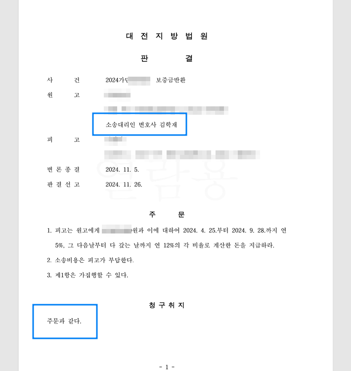 2024년 11월 27일 보증금반환소송 전부 승소했습니다.
