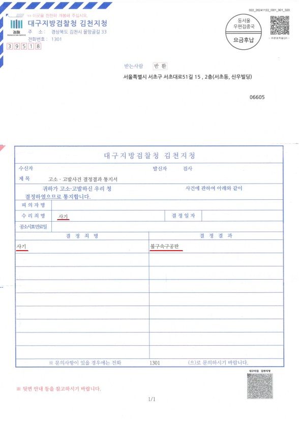 법리와 판례를 토대로 신중하고 꼼꼼한 고소 진행을 한 결과, 의뢰인님께서는 피해금액 전액을 변제 받으셨습니다. 그러나 사기죄는 합의를 하거나 피해 회복이 이루어졌더라도 혐의가 인정되면 처벌이 이루어지기 때문에 대구지방검찰청 김천지청은 피의자의 사기 혐의를 인정하여 기소하였습니다.
