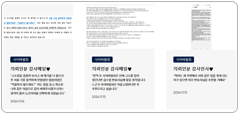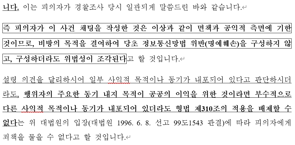 법리적 측면에서도 대법원 및 법원의 입장을 정치하게 주장함으로써, 의뢰인분의 행위가 명예훼손으로 처벌받을 수 없다는 점을 분명하게 밝혀냈습니다. 수사기관 입장에서도 저희가 제시한 대법원과 법원의 입장에 반하여 명예훼손 성립의 판단을 내리기에는 압박을 느끼셨을 것으로 생각합니다.