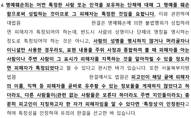 이에 대하여 " 그 표시가 피해자를 지목하는 것을 알아차릴 수 있을 정도"에 해당하는지 여부에 대하여 설득해 내는 것은 변호사의 경험과 역량에 크게 의존한다고 해도 과언이 아닙니다.