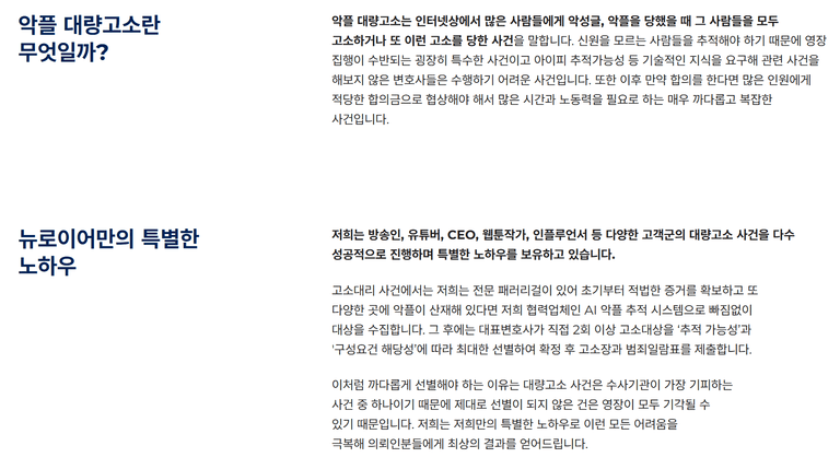 저희 뉴로이어는 제가 명예훼손 전문 변호사로 활동을 시작한 후에 차츰 인접분야로 영역을 넓혀 현재는 사이버범죄 특화 로펌이 되었지만 명예훼손이 가장 큰 포션을 차지하고 있는데요. 그 중에서도 <악플고소>는 저희 내부에 별도의 전문인력(패러리걸팀)이 있을 정도로 가장 집중하고 있는 사건이기도 합니다.