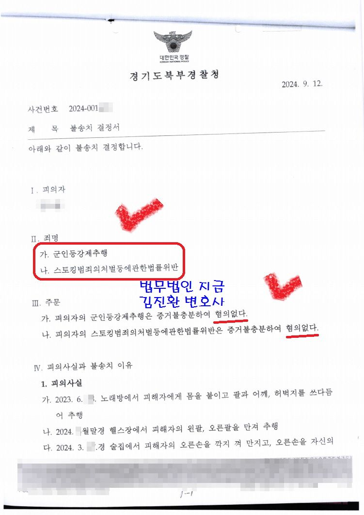 ○ 피의사실 : 피의자가 노래방 등 여러 장소에서 6차례에 걸쳐 피해자의 몸을 만져 추행하고, 수십회에 걸쳐 전화 발송, 카카오톡(문자메시지) 전송 등을 하여 스토킹범죄행위를 함
